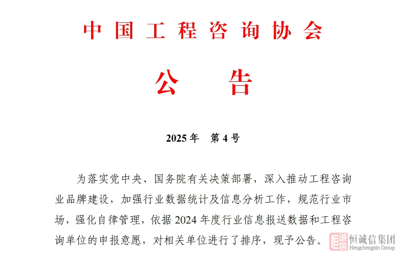 恒誠信國際工程咨詢有限公司榮登中國工程咨詢協(xié)會兩項百強榜單