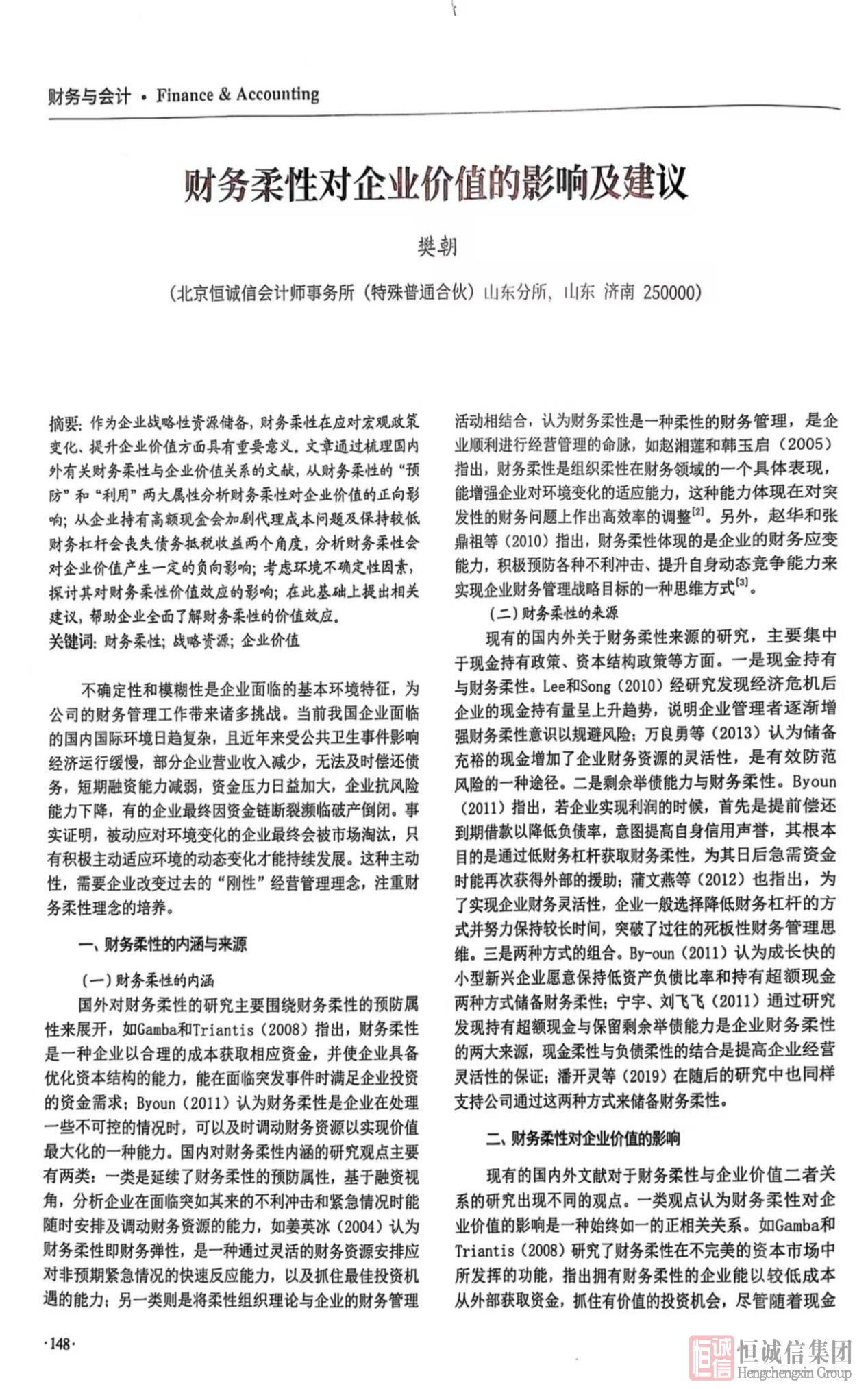 近日,北京恒誠(chéng)信會(huì)計(jì)師事務(wù)所(特殊普通合伙)山東分所樊朝撰寫(xiě)的學(xué)術(shù)論文《財(cái)務(wù)柔性對(duì)企業(yè)價(jià)值的影響及建議》,在省級(jí)期刊《知識(shí)經(jīng)濟(jì)》的 “財(cái)務(wù)與會(huì)計(jì)” 板塊成功發(fā)表。這一成果不僅是樊朝個(gè)人學(xué)術(shù)研究能力的體現(xiàn),更是恒誠(chéng)信會(huì)計(jì)師事務(wù)所重視專(zhuān)業(yè)人才培養(yǎng)、推動(dòng)學(xué)術(shù)研究與知識(shí)創(chuàng)新的有力見(jiàn)證。